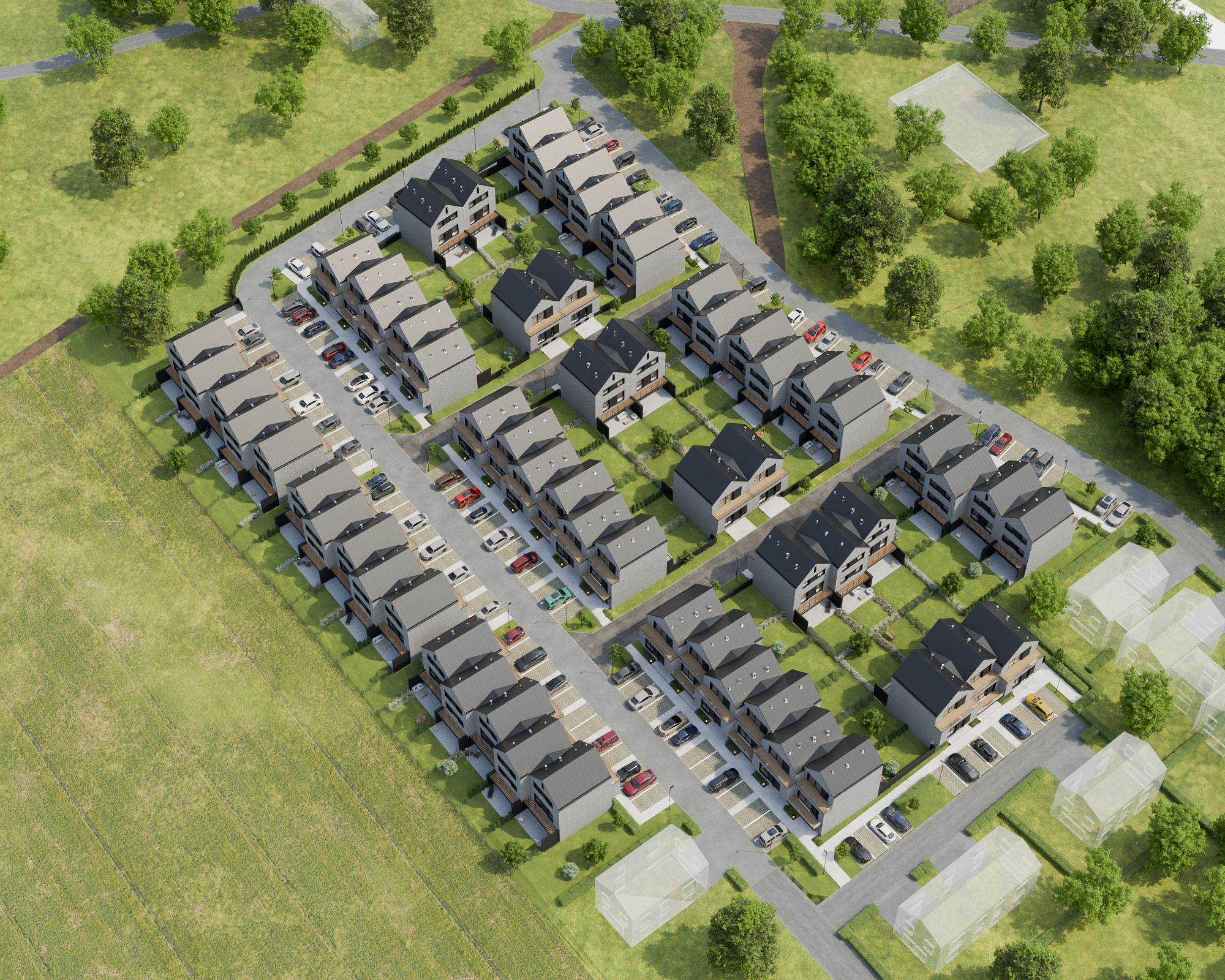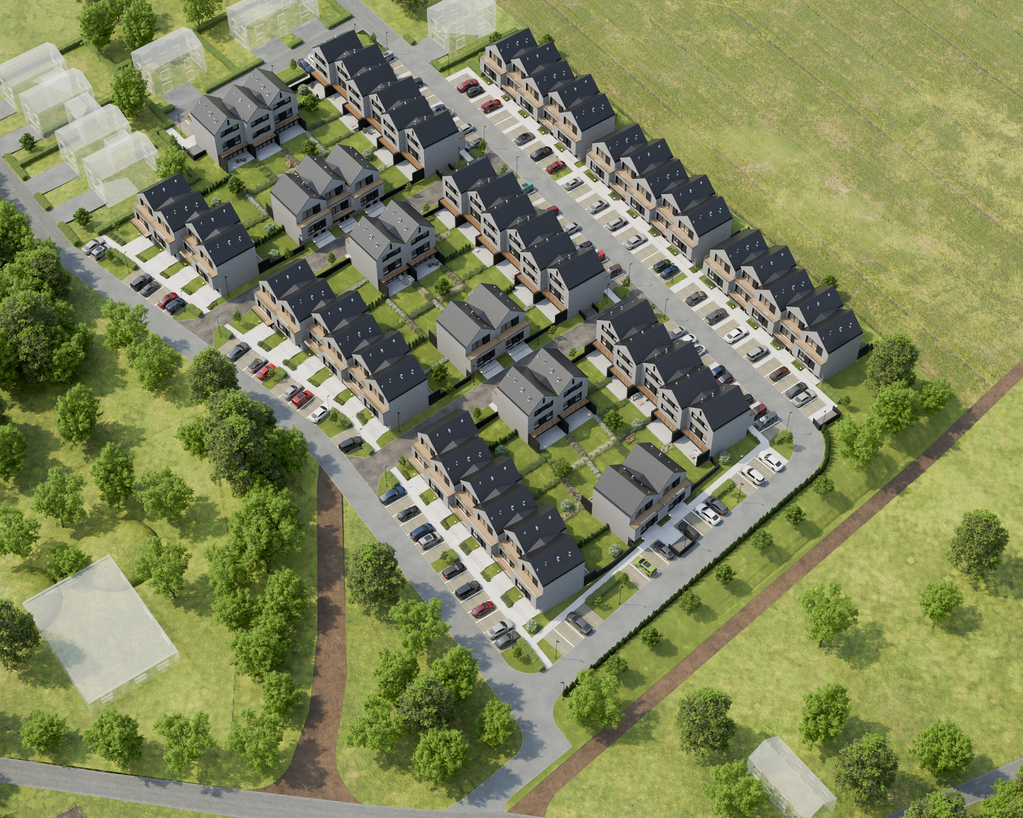 Zapomnij o problemach z parkowaniem – u nas masz do dyspozycji wygodne miejsca postojowe, zarówno dla mieszkańców, jak i dla gości. Utwardzone drogi, szerokie chodniki oraz starannie zaprojektowana infrastruktura sprawiają, że codzienne funkcjonowanie na osiedlu jest bezproblemowe. Bezpieczeństwo i komfort mieszkańców to priorytet – dlatego teren inwestycji jest doskonale oświetlony, a układ przestrzeni sprzyja wygodnemu poruszaniu się zarówno pieszo, jak i samochodem.